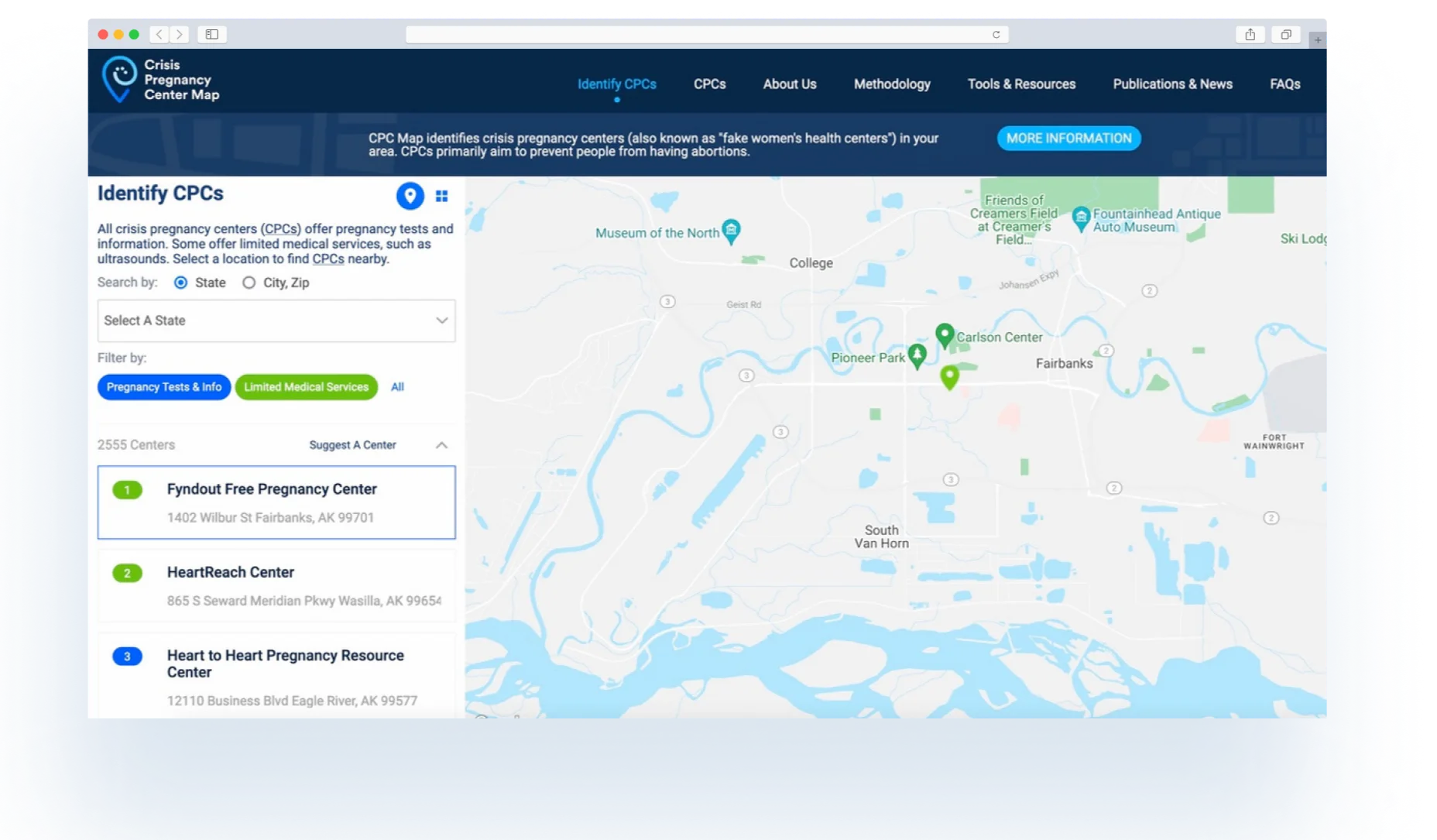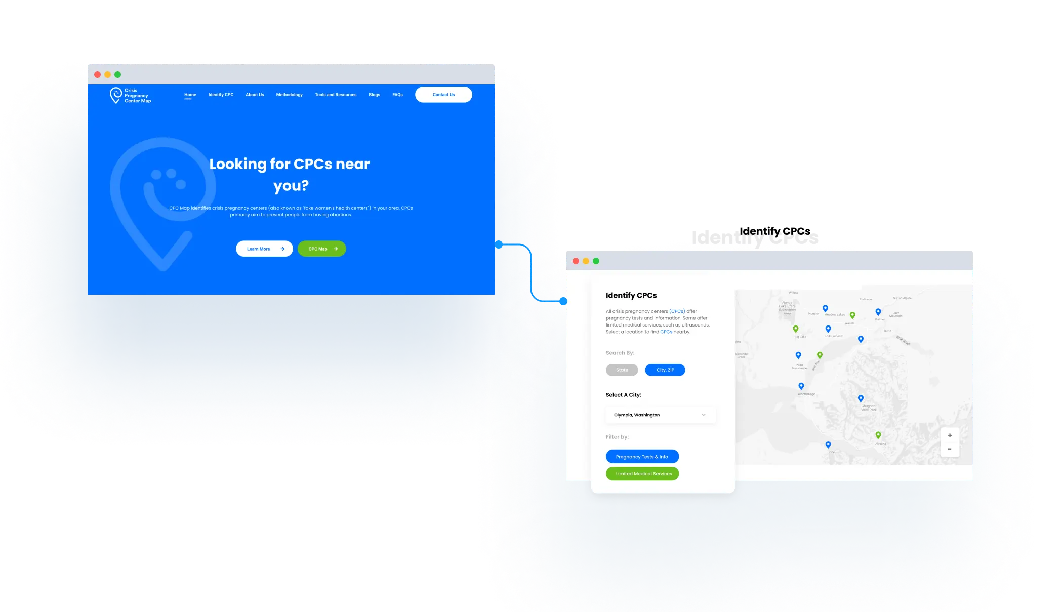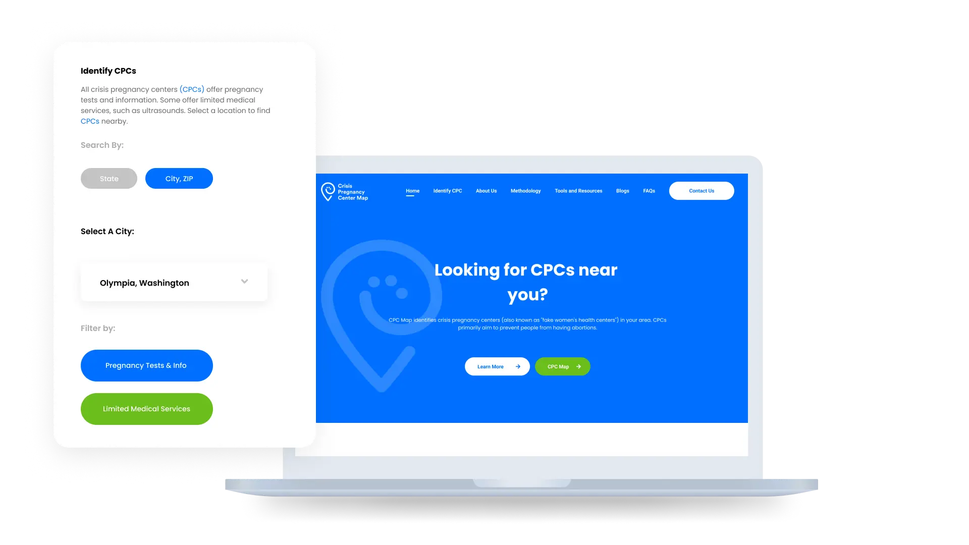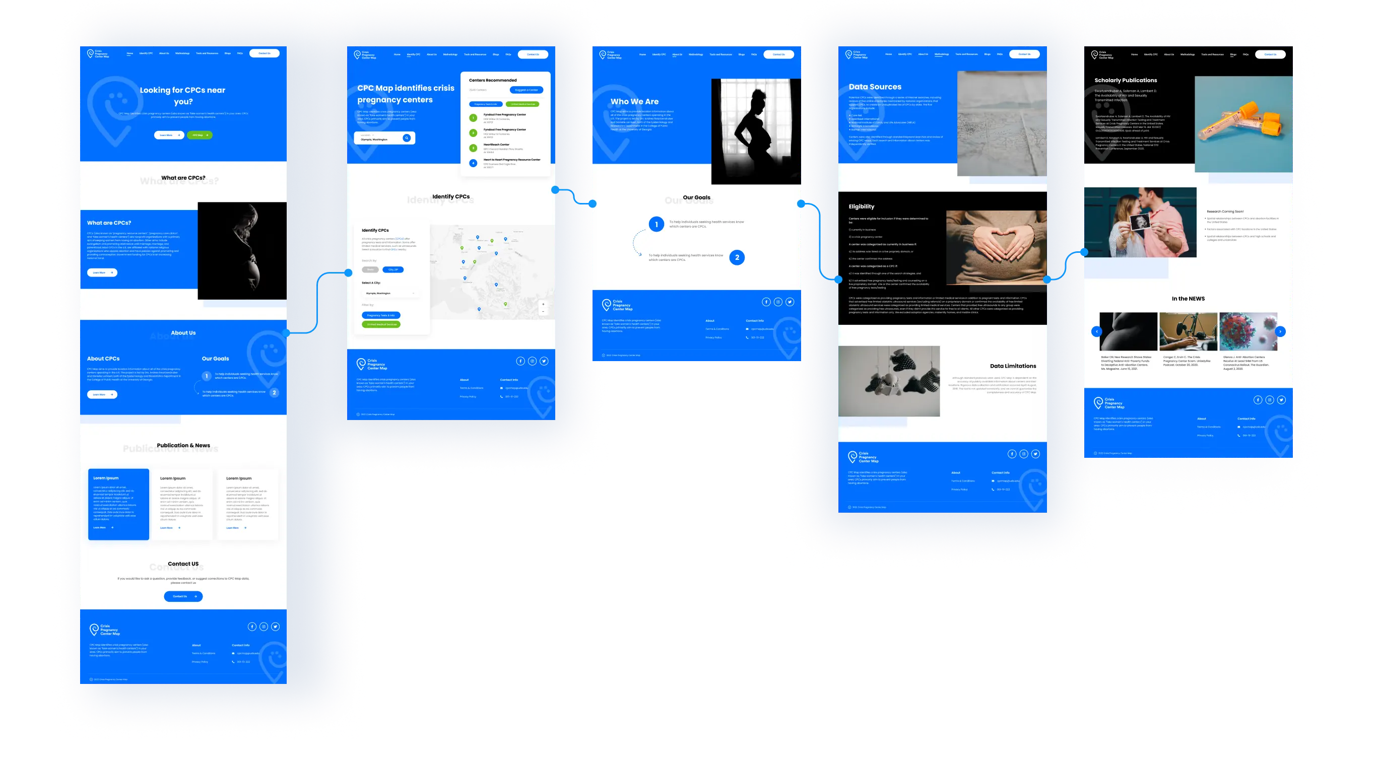 The website "Crisis Pregnancy Center Map" is a directory of Crisis Pregnancy Centers (CPCs) in the United States. The site's home page looked outdated and was difficult to navigate that led to a need for a full redesign that incorporates the same brand elements.